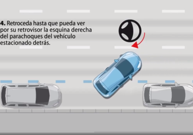 3) Dé marcha atrás, girando todo el volante hacia la derecha