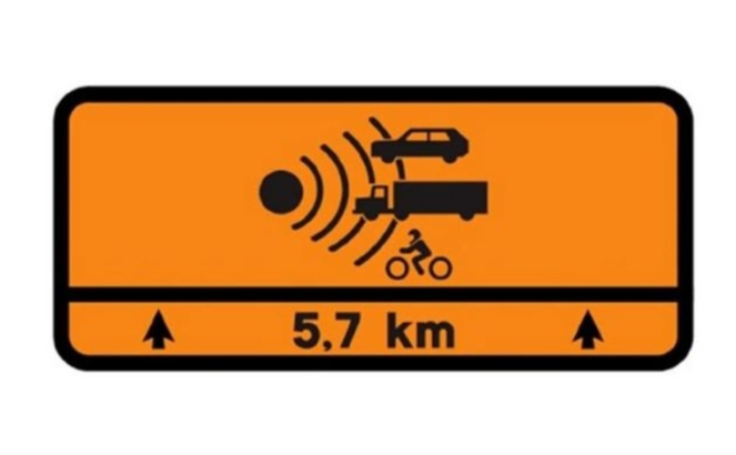 Una de ellas es una horizontal con fondo naranja y en la que aparecen un coche, un camión y una moto con un icono normalmente asociado a un radar. Además, debajo de estas representaciones, indica una distancia determinada en kilómetros.